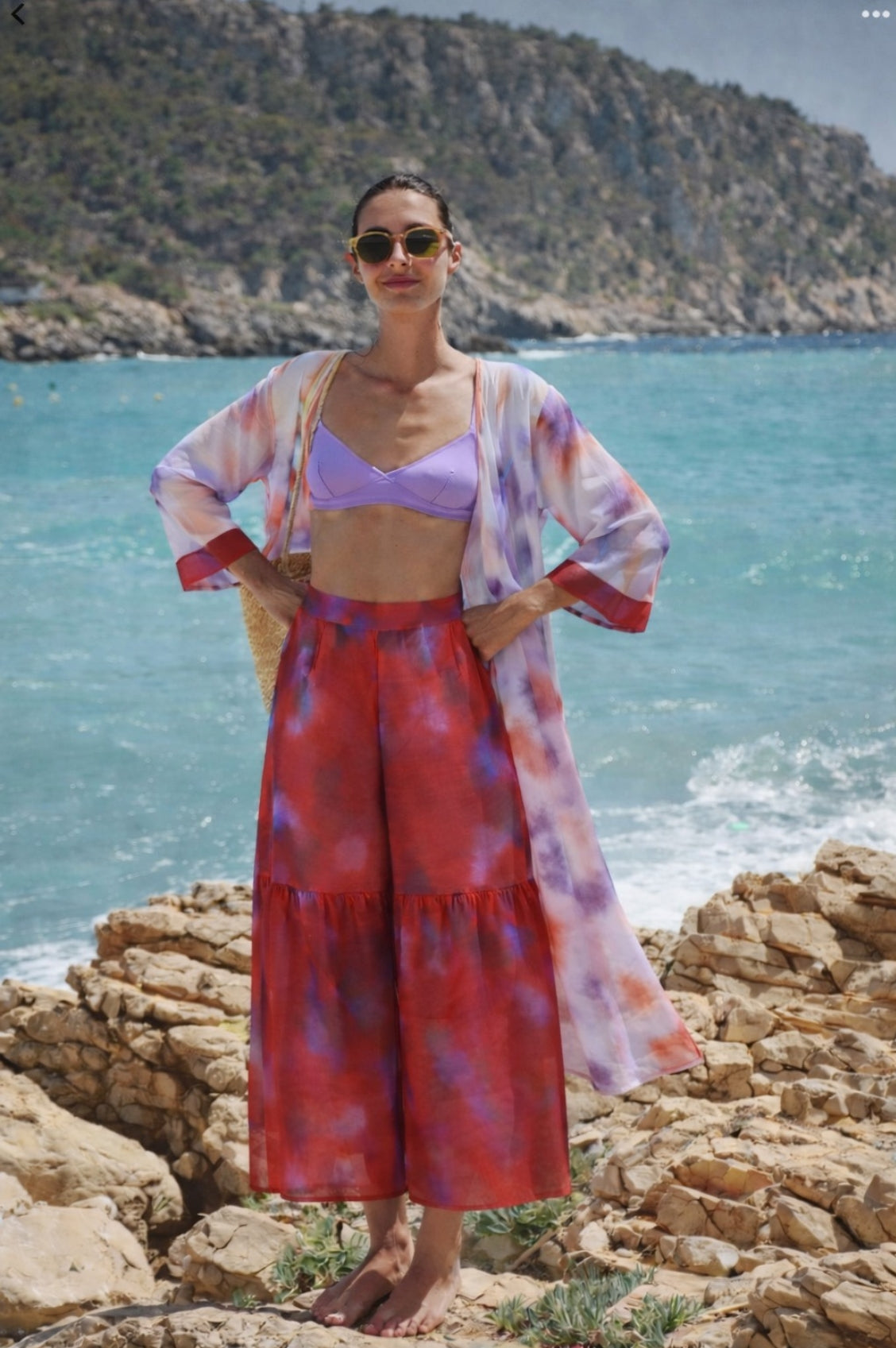 El Kimono Santorini es unitalla y cuenta con un botón frontal, lo que permite llevarlo abierto o cerrado según el look que quieras crear. Su caída suave y su silueta relajada lo convierten en la capa perfecta para complementar cualquier outfit de playa.
