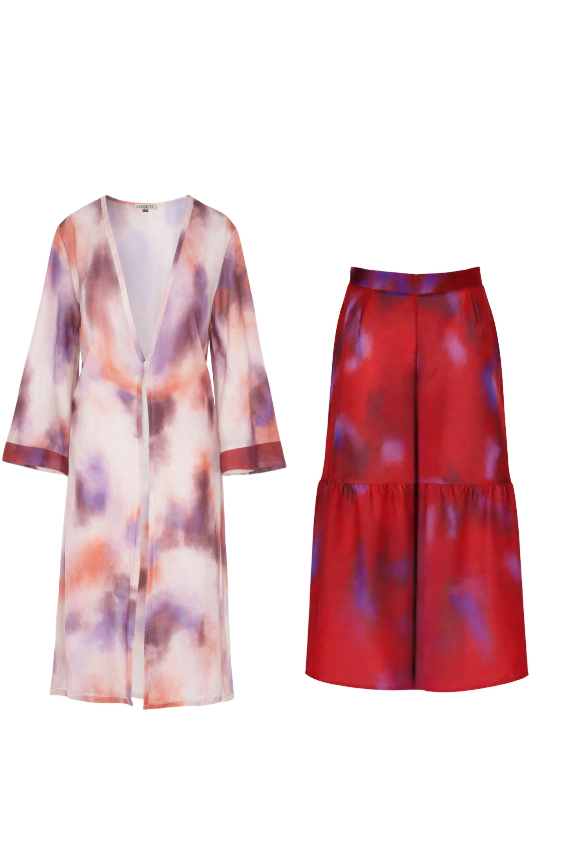 Ambas piezas comparten el mismo print exclusivo de Xambrita, pero en colores contrastantes, lo que crea un conjunto visualmente armonioso y moderno que se puede usar junto o por separado.